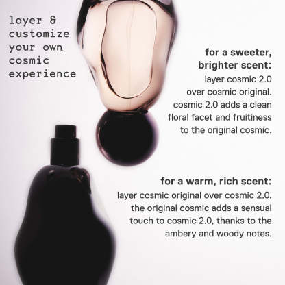 journey through the cosmic universe with 100ml sizes of cosmic kylie jenner and cosmic kylie jenner 2.0. my debut scent is a warm, sweet, ambery fragrance and 2.0 is its fresh, sweet, floral sister. layer the original over 2.0 for a warmer, richer scent or 2.0 over the original for a brighter, sweeter scent.