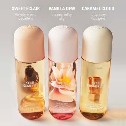 my hair & body mist trio includes all three of my dessert-inspired, gourmand mists. infused with vanilla, each scent combines the richness of indulgent desserts with the sophistication of fine fragrances. decadent, elevated, and indulgent – wear them on their own or layer for a custom gourmand moment.