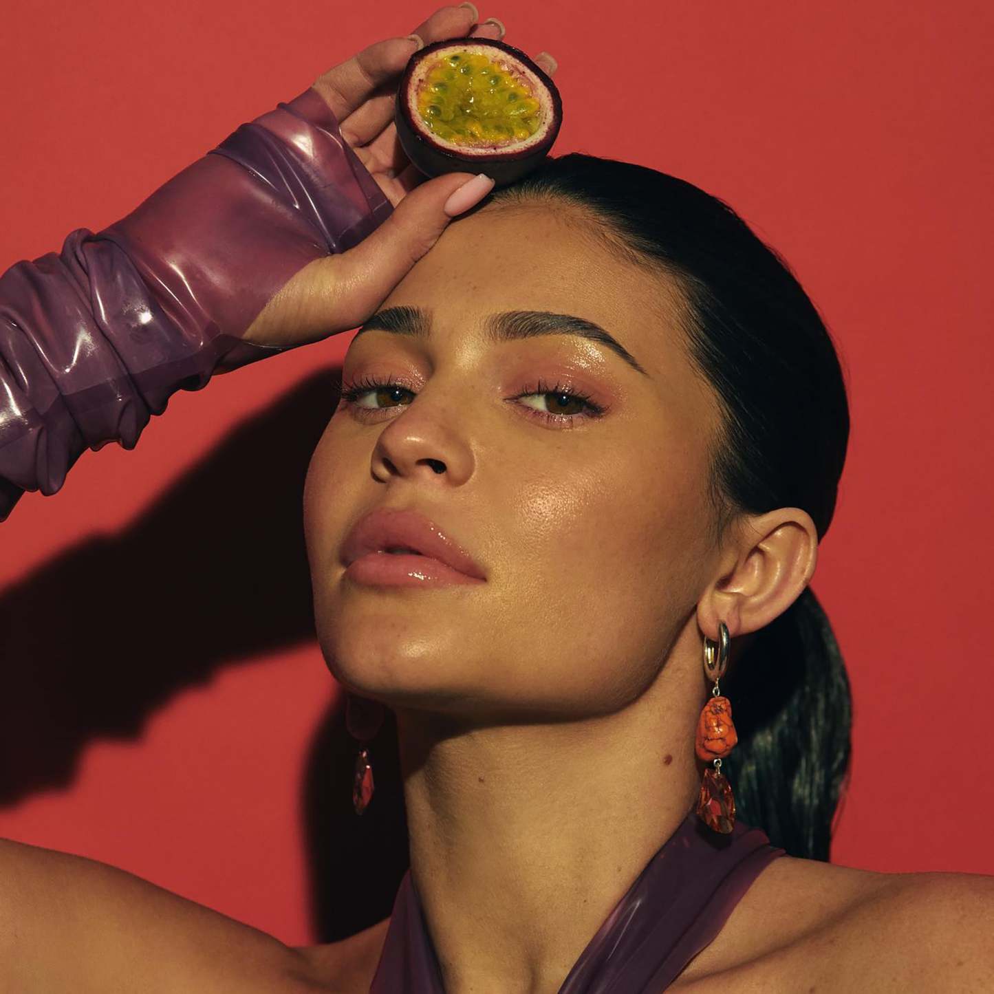 hydrogenated polyisobutene, isononyl isononanoate, ethylene/propylene/styrene copolymer, diisostearyl malate, polybutene, butylene/ethylene/styrene copolymer, parfum/fragrance, tocopheryl acetate, caprylic/capric triglyceride, cocos nucifera (coconut) oil, passiflora edulis seed oil, rubus idaeus (raspberry) seed oil, sodium saccharin, pentaerythrityl tetra-di-t-butyl hydroxyhydrocinnamate, undaria pinnatifida extract, tocopherol, synthetic fluorphlogopite, calcium aluminum borosilicate, mica, calcium titanium borosilicate, alumina, calcium sodium borosilicate, silica, dicalcium phosphate, triethoxycaprylylsilane, c20-24 olefin, tin oxide, iron oxides (ci 77491, ci 77492), yellow 6 lake (ci 15985), blue 1 lake (ci 42090), red 7 lake (ci 15850), titanium dioxide (ci 77891), yellow 5 lake (ci 19140).