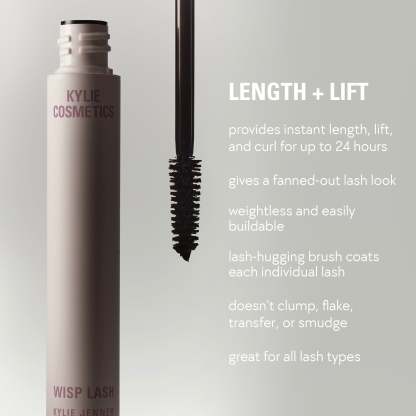 get long, lifted, and fanned-out lashes with my wisp lash mascara kylie jenner. this formula weightlessly builds, gives ultra-separation, and provides feathery, wispy lashes. it’s clump-free and offers up to 24 hours of length and curl without flaking or smudging.
